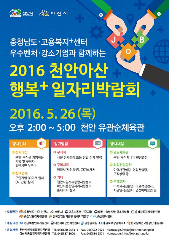 2016 천안아산 행복+ 일자리 박람회가 5월 26일 목요일 오후 2시부터 개최됩니다.