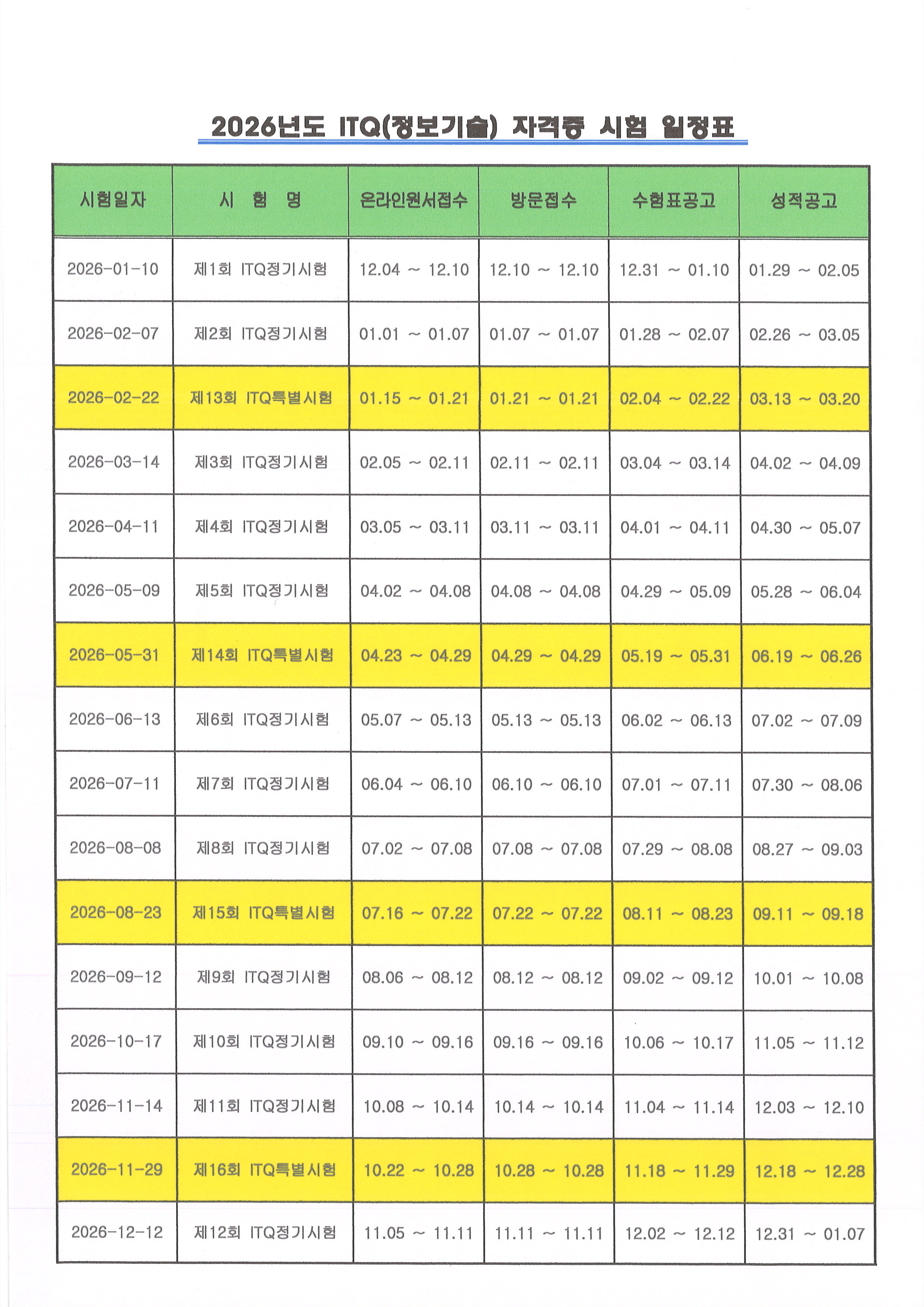 [공지]2026년도 ITQ(정보기술) 자격증 시험 일정표